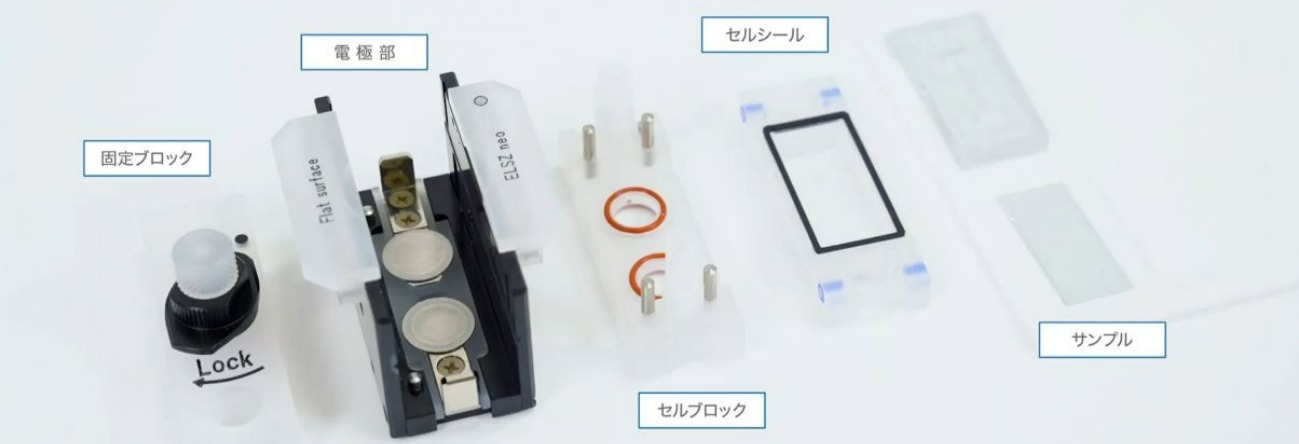 固體表面電位是將平板樣本緊密接觸於盒型石英Cell上方而形成一體的構造。