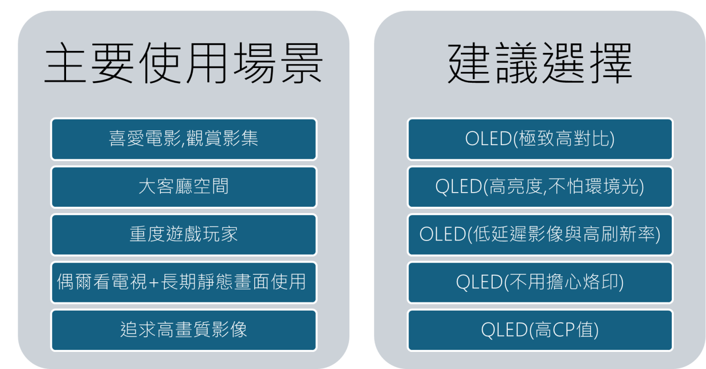 | QLED | 商業展示、高亮環境、居家影音 | 色彩飽和、亮度高、不易烙印 | 黑位表現不及 OLED |
